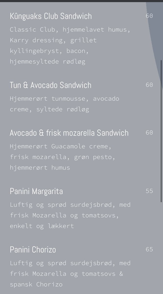 Kunguak Cafe & Icebar offers a menu that strikes a careful balance between fresh, local ingredients and inventive flavors, making each dish memorable. The highlight of the menu is undoubtedly the Avocado, which is prepared with a delicate combination of textures and seasonings that elevate a familiar favorite into something exceptional. The café complements this with an array of small plates and hearty options, all crafted to showcase Greenlandic produce and seafood in refined ways, ensuring every bite feels thoughtfully curated. The pricing is accessible, reflecting the quality of ingredients without feeling extravagant, and the portion sizes are satisfying enough to leave diners content without excess. From refreshing light bites to more substantial offerings, the menu maintains a consistent standard of creativity and flavor, making Kunguak Cafe & Icebar a destination for both casual meals and special culinary experiences in Qaqortoq.